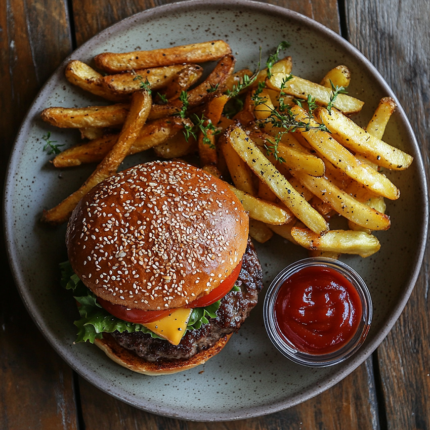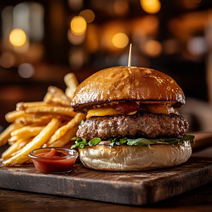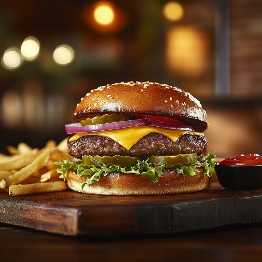 Rindfleisch-Patty, Cheddar-Käse, Salat, Tomate, Zwiebeln, Gewürzgurken, Ketchup, Mayo