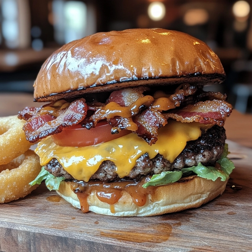 Rindfleisch-Patty, knuspriger Bacon, Cheddar-Käse, Röstzwiebeln, BBQ-Sauce, Salat