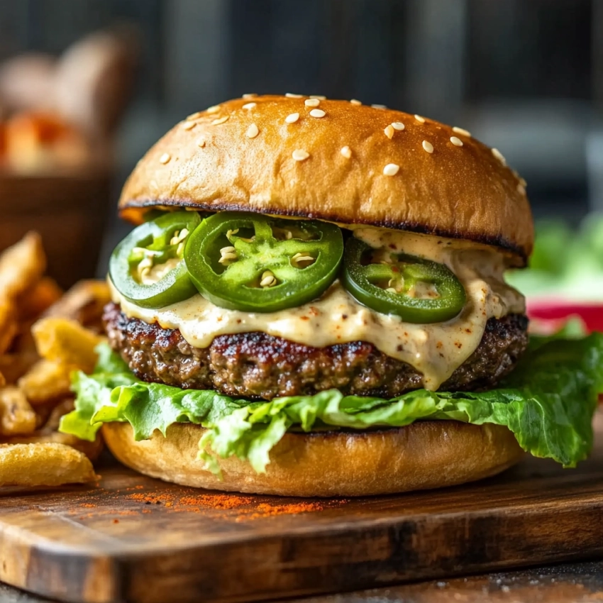 Rindfleisch-Patty, Jalapeños, Pepper Jack Käse, würzige Chipotle-Mayo, Salat