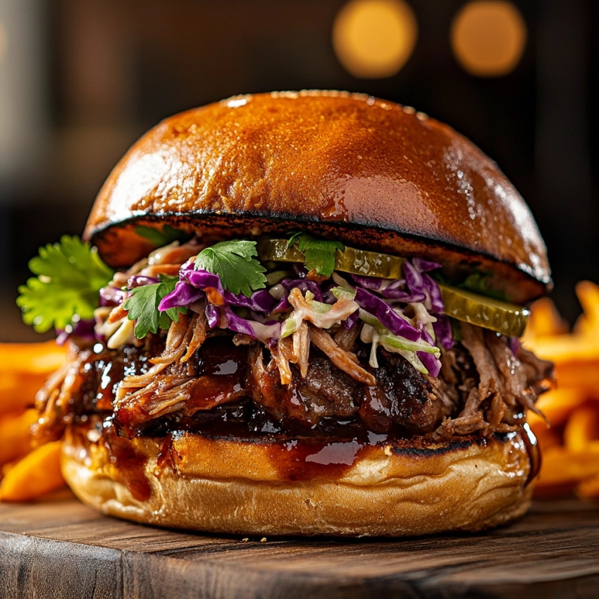Zartes Pulled Pork, Coleslaw, BBQ-Sauce, karamellisierte Zwiebeln